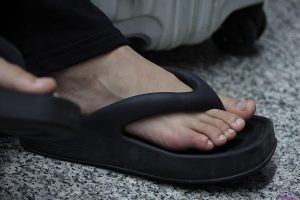 (裸足)丽人脱掉蝴蝶结凉鞋露美脚坐在按摩椅上秀,厚实饱满但保养蛮好的一双美脚!28张