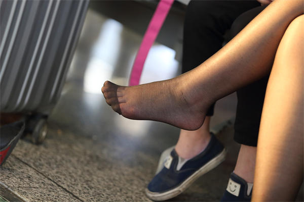 (裸足)非常漂亮的年轻美女脱掉闷了好久的鞋,脚放在旅行箱大秀!100张