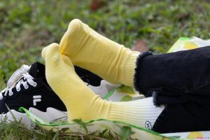 (袜子)户外戴耳麦的美女大学生脱掉运动鞋伸直双脚秀她性感黄色的棉袜子美脚,动作十分惬意!47张