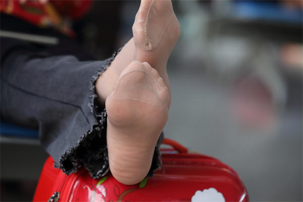 (丝袜)熟女她脱掉鞋把丝足放在旅行箱上秀,丝足好性感啊!21张