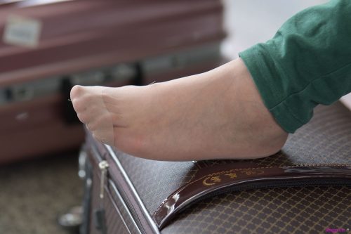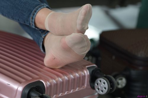 两位轻熟妇就个人而言左边显得富态,一般老板娘都爱这样打扮.然而右边轻熟妇就看起来正统很多了,细看样子还挺好看的.因为她们要PK的关系,她们都脱掉了鞋子直接把超薄短丝足放在各自的旅行箱上大秀起来,左边轻熟妇的动作绝对是够大方的了,让大伙们对她的丝足脚面和脚底看得清清楚楚,细看脚骨还蛮大的,胜在有丰富多样的丝足动作,让人看了深深地爱上.不过小弟钟情于右边的轻熟妇,长款的墨绿色裤子遮掩这丝袜裤筒,只露出迷人的超薄丝袜美脚,脚趾是我最喜欢的部位,修长精致的脚指,这套放箱大秀的丝足表演属实精彩啊!